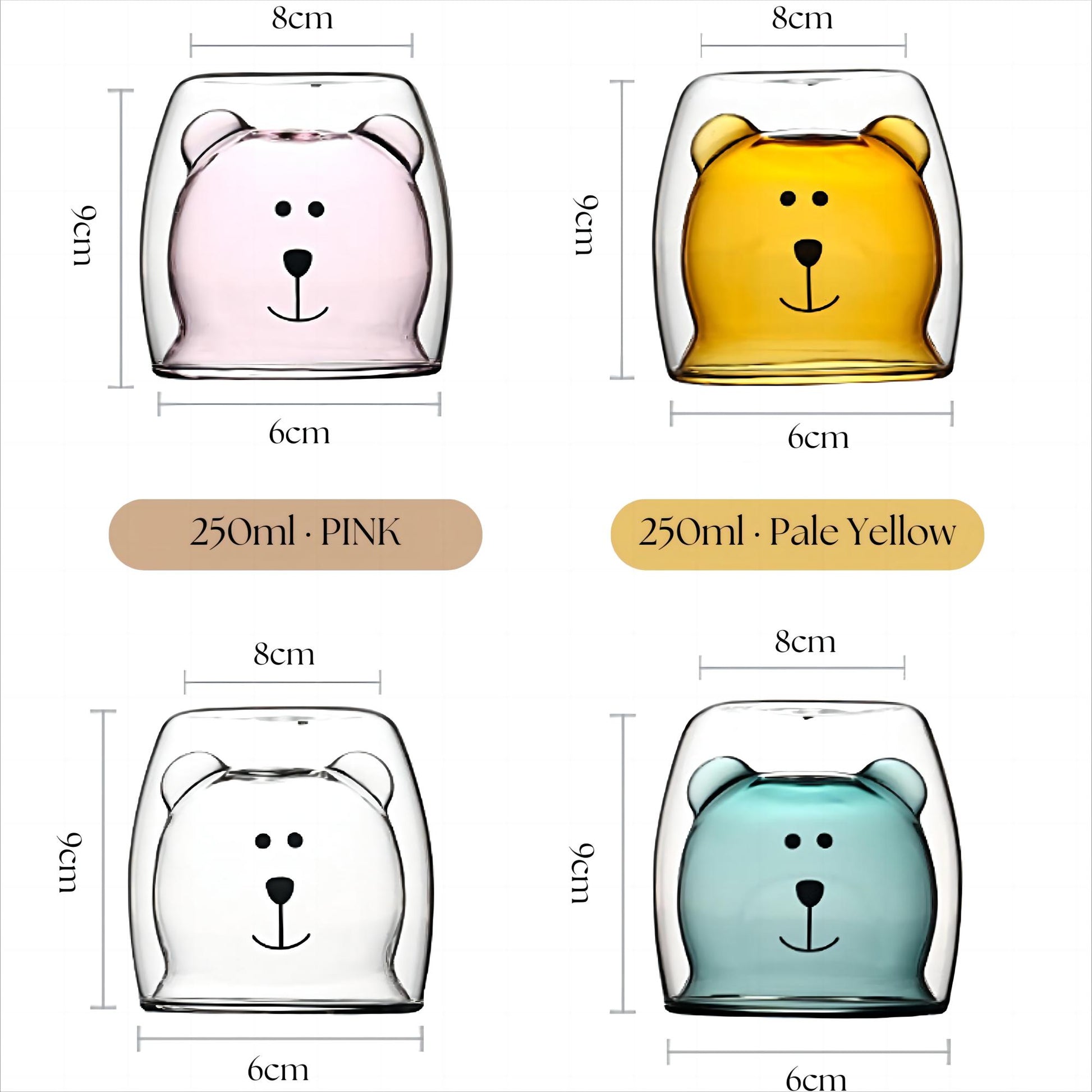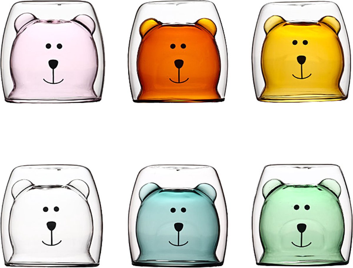 6 pieces of 250ml double-walled bear design glasses in different colors: